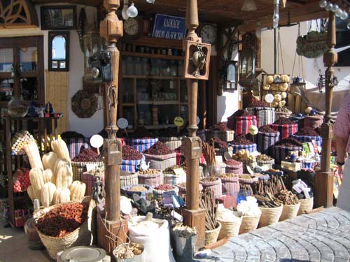 Spices, hibiscus tea leaves, sea sponges and other goodies for sale |