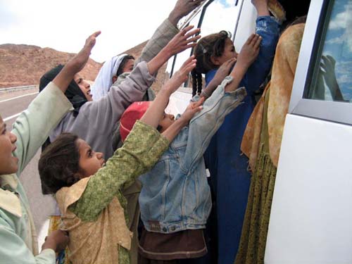 Our bus stopped at a picturesque spot. Bedouin herders were making their way down the hillside to their camp, with their camels and black goats. These children stayed along the road. When our bus pulled over, the children ran down the hill towards us. They were dirty and sort of wild-looking, with hair askew and soiled clothing over their brown bodies. The children tried to sell us jewelry and geodes which they kept in scraps of cloth. Our hotel had provided us with breakfast sacks. The remainders got their attention when our guide offered it to them. One girl grabbed a piece of bread, but another yanked it away. A fight ensued and the bread ended up on the highway. |