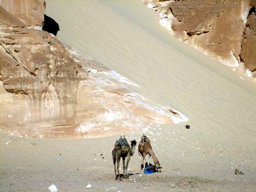 Sinai Peninsula was stark, bleak, dry and bare, save for small acacia trees here and there. Granite mountains were streaked with ribbons of black basalt, and some of the landscape was red with iron. The wind and sand made interesting textures. The air was cold and the sky was bright blue. We saw Bedouin camps ("desert dwellers") and their black goat hair tents, herds of sheep and their few camels. |