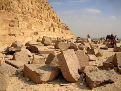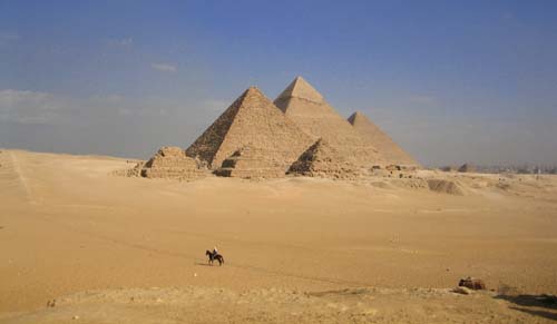 These are the magnificent pyramids at Giza, from left to right: Menkaure's pyramid, Pyramid of Kephren, and the Pyramid of Khufu (aka Cheops or the Great Pyramid). Their size is astonishing! The three in front are queens' pyramids. Although the pyramids appear to be in the middle of the Sahara desert, they are at the very edge of Cairo. |