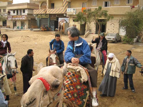 At the Giza pyramids, we rode camels and horses. Mum had an accident, falling off her camel during the dismount, when the camel was startled and stood up suddenly. However, no major fractures, thanks to her Fosamax, only bumps and bruises on head, elbow, back and legs. She rested for two days and applied assiduous applications of a wonder Chinese liniment, and was then able to walk, albeit at a slow pace as we continued our vacation . |